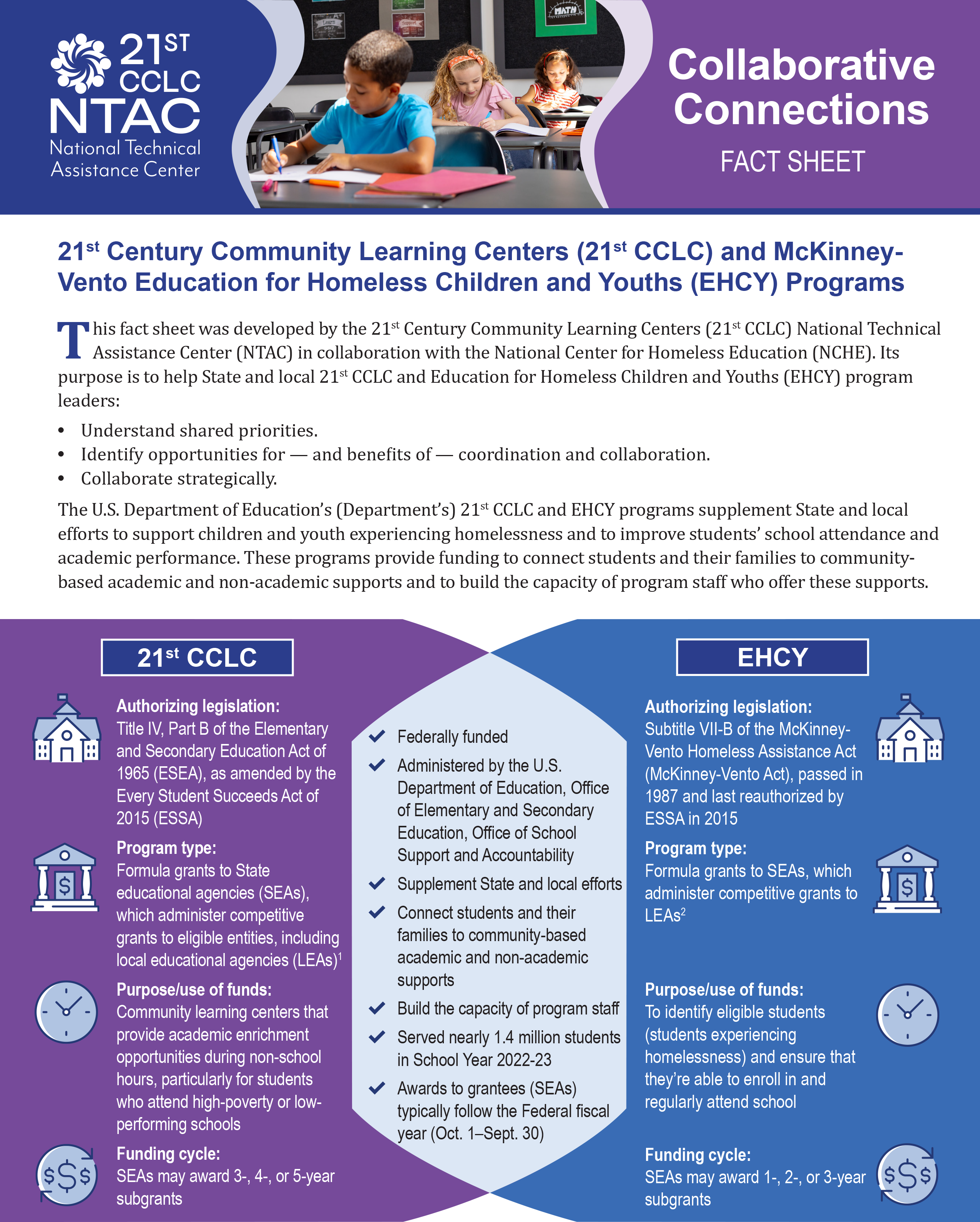 This fact sheet highlights the similarities and differences between 21st Century Community Learning Centers (21st CCLC) and McKinney-Vento programs. Designed for state and local leaders overseeing these federally funded initiatives, it offers insights to help identify common goals and explore opportunities for strategic coordination and collaboration.